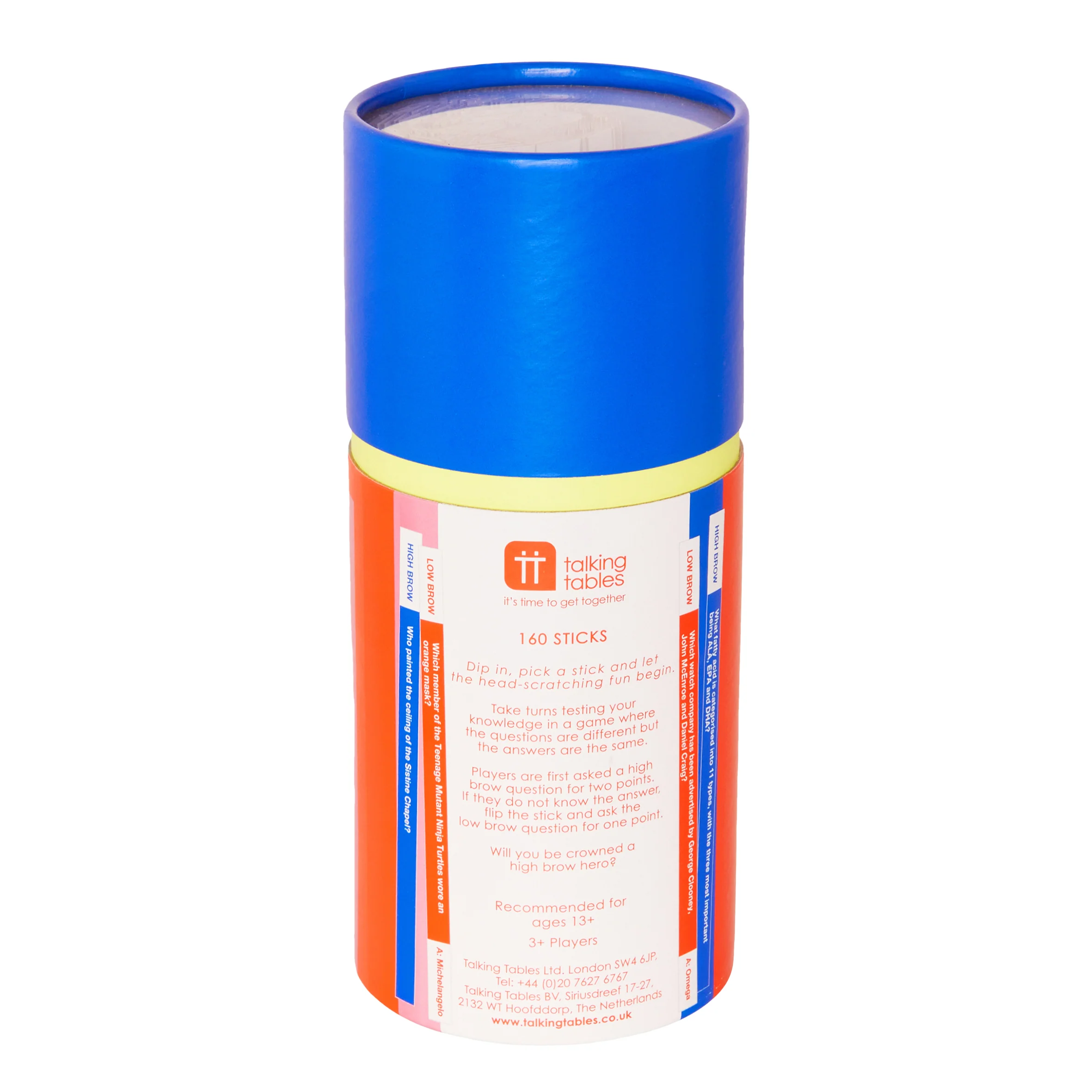 | The High Brow Low Brow Dipsticks Game by Talking Tables. Dip in, pick a stick and let the head-scratching fun begin. Take turns testing your knowledge in a game where the questions are different but the answers are the same! Can you answer the high brow question for two points? If not, flip the stick and attempt to answer the low brow question for one point. The perfect game to play with family and friends. Contains 160 double sided question sticks Recommended for age 7+ and 2+ players |